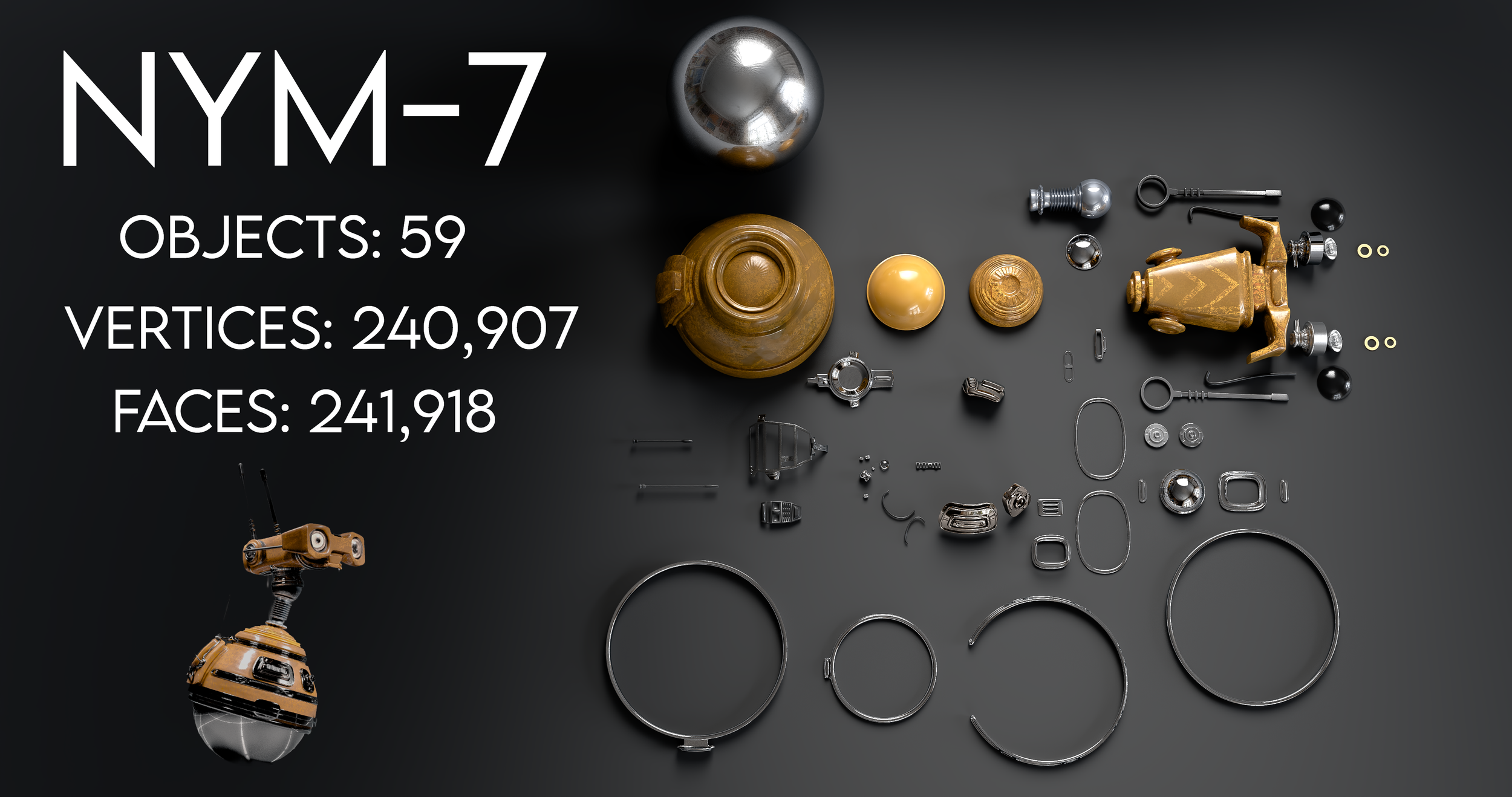 NYM stands for NEW-YEARS-MODEL. This is my first project of 2026. NYM has 59 individual parts. All modeling and texturing done in Blender. Post process done in Photoshop and DaVinci Resolve.